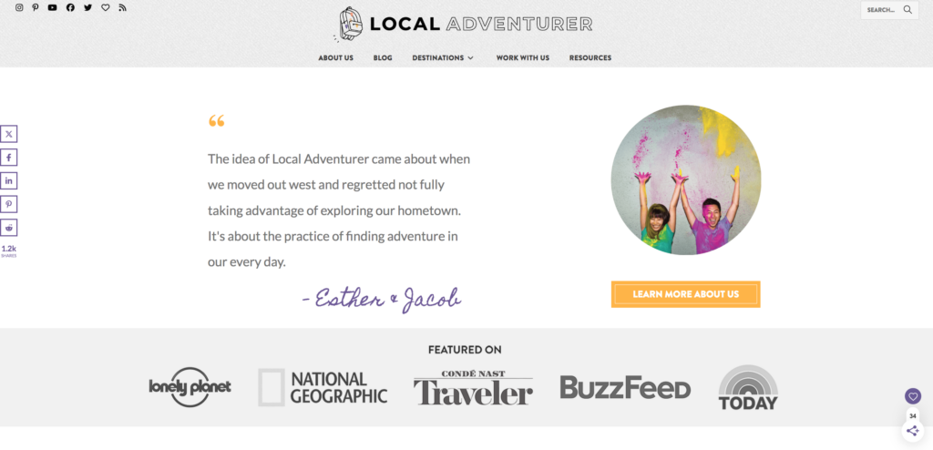 Local Adventurer was originally created in 2013 and today gets about 600k+ monthly pageviews and 300k+ monthly unique visitors. The blog earns over 6 figures a year, and they donate 30% of their income to various non-profits.